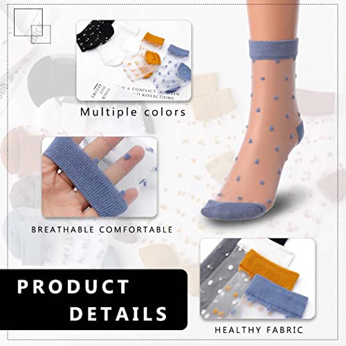 Fabric type: PolyesterCare instructions: Machine Wash,Do Not Iron,Do Not BleachOrigin: ImportedPattern: Polka DotsSheer ankle socks are made of high-quality polyester and silk, snug and breathable, as if you are not wearing anythingsheer design socks are elastic,one size fits most women and girls. In four fashionable colors - blue, yellow, black, and white, perfect for adding a subtle elegant touch to any outfitCute sheer socks make women or girls feet look very sexy and eye-catching.Thin lace ankle socks are perfect for women and girls and are easy to match with different styles of clothing and shoes. See through socks women are very comfortable without grinding your feet.It are also suitable for sunrise travel,work,school and other occasionsPolka dot sheer socks are soft, stretchy, breathable and lightweight. The toes and heels are made of durable cotton, making the socks long-lasting. And ultrathin mesh crew sock will not fall off easily, perfectly fit the foot shape, very refreshing, not stuffy. Perfect gift for your lover, family, and friendsAny questions about women sheer ankle socks can be contacted with us, we will reply and handle it for you within 24 hours Perfect for everyday use. superior materials and excellent craftsmanship ensure long-lasting durability.