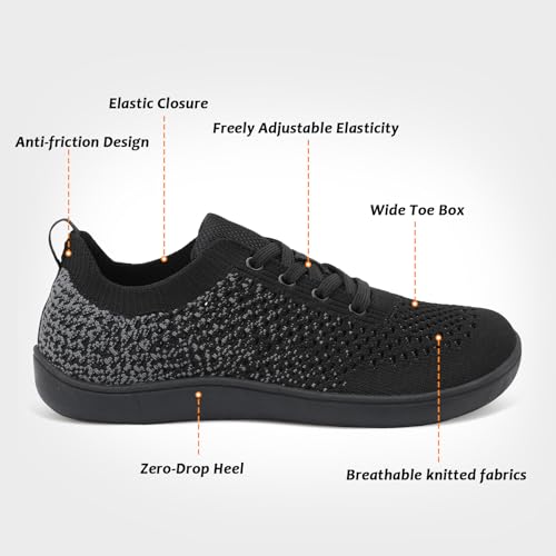 Outer material: 70%knit+30%rubberClosure type: Lace-UpWide Toe Box: Accommodates swollen feet, bunions, and other foot conditions, Health-Focused Design, Crafted with the needs of sensitive feet in mindBreathable Knit Fabric: Diabetic-Friendly, tender, non-binding materials to protect sensitive feet, great for pregnant women experiencing swelling or discomfort, keeps your feet cool and dry, even during extended wearBarefoot Design: Zero-drop sole for a natural walking experience, enjoy all-day support without sacrificing styleAnti-slip and Durable Sole: The rubber sole of the women walking shoe is paired with anti-slip patterns, making it more hard wearing. The powerful traction allows you to walk on smooth floors without slippiWidely Applicable: walking, working, running, shopping, driving, hiking, travel, jogging, this barefoot shoe is a good choice. Perfect for everyday use. superior materials and excellent craftsmanship ensure long-lasting durability.