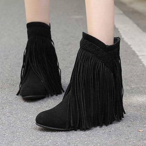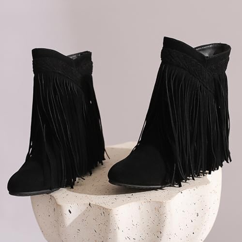 Alyaafifa Fringe Boots for Women Chunky Block Wedge Heel Wide Calf Ankle Booties Closed Toe Pull On V-Cut Short Boots with Tassels Dressy Trendy relaxing