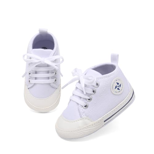 Baby Boys Girls Star High Top Sneaker supple Anti-Slip Sole Newborn Infant First Walkers Canvas Denim Shoes (11cm, A-White, 0-6 Months Infant)