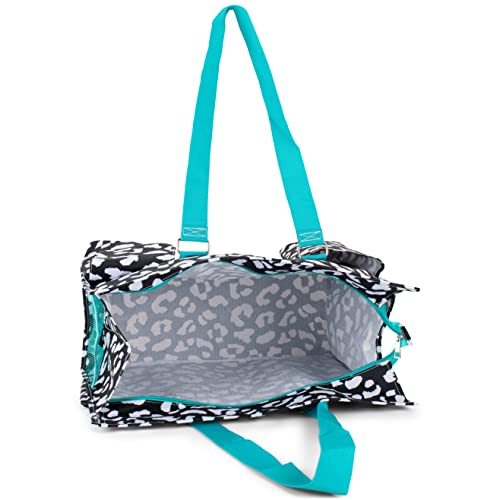 - Features a black and white leopard design with zip closure, six (6) exterior pockets including two (2) mesh pockets on the ends, and webbed handles
