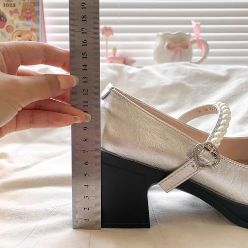 ZQW Cute Women's Pearl Bow Block Heel Mary Jane Shoes Comfy Round Closed Toe Buckle Pumps Cosplay Heels Dressy Casual Office