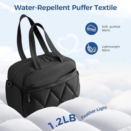 Gym Bag for Women, Puffer Travel Duffle Bag With Shoes Compartment & Wet Pocket, Carry On Tote Bag For Weekender, Overnight, Sport (Black)