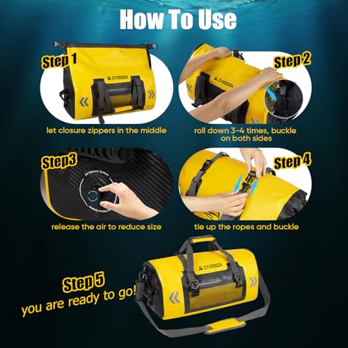 【Full Protection Waterproof Duffel Bag】 Constructed from commercial-grade PVC 500D materials for high performance and durability, our dry bags waterproof is meant to last a lifetime! All seams are adopted high frequency wave pulse technology to ensure all your gear stays completely dry and safe! Ideal weekender dry bag for all your sailing, kayaking, rafting, boating, swimming, camping, hiking, beach, fishing, and outdoor travel adventures.【Upgraded Design 】 1. We adopt the zippered closure(2pcs zipper pulls) on the waterproof bag entrance instead of the velcro closure of other dry duffel bags in the market, more convenient and reliable; 2. Three inside pockets(2 zippered pockets, one for laptop, ipad, books etc, the other for phone, passport, jewelry, watch etc, as well as 1 large mesh bag) and an external zippered mesh pocket give you lots of place to store small items; 3. Reinforced two layers bottoms for harsher environments.【Easy to Use & Large Storage】 Featuring a large main compartment with roll-top zipper closure and single reinforced strip, simply fold the waterproof duffel' pocket down 3-4 times, buckle, and ready to go! With the high level night reflective design, promise you are safe on the night journey. Air release valve is convenient to discharge the air inside and reduce the volume when binding. 66L(17.5Gal) fits everything from clothes & swimsuits & snacks to phones, laptops & cameras.【cozy to Carry】 4 ways to tote: Assembled with 1pcs adjustable, removable cushioned shoulder strap, sling it over your shoulder as crossbody bag; 2pcs padded double handle straps, just grab the handle & go as travel handbag; Or separate the 2pcs handle straps on your shoulder as backpack; Another 4 binding straps are used to tie up the waterproof dry bag on motorcycle; 1000D Molle looping provides anchor points to fasten onto while boating or kayaking.【What You Get 】 1 Unit of ZARSSON Waterproof Duffel Bag + 1 adjustable, removable shoulder straps +4 binding straps for waterproof motorcycle dry bag. If our dry bag for travel fails because of a defect in material or the quality of workmanship, we will replace it. Our factories follow a strict set of specifications and quality standards, however, if a problem develops, please let me konw for any issues, we promised to solve for you within 24 hours. Perfect for everyday use. premium materials and excellent craftsmanship ensure long-lasting durability.