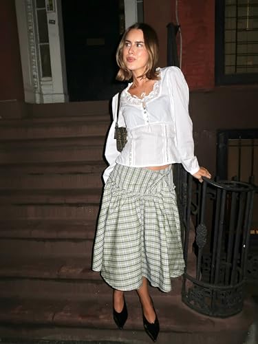 Women Y2k Plaid Midi Skirt High Waist Tie Up Ruffle Pleated A Line Vintage Preppy Gingham Flowy Skirt Streetwear