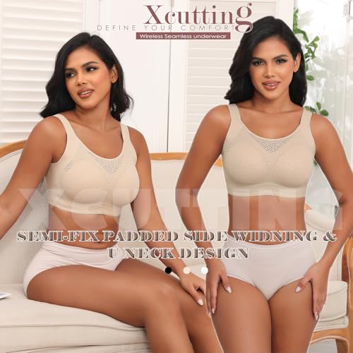 Fabric type: 76.6%Nylon,23.4%SpandexCare instructions: Both Machine Wash and Hand washableOrigin: ImportedClosure type: Hook & Eye【Elegant Lace Design】Xcutting wirefree bras with the Round-neck and lace edge design provide a smooth transition and lift the breasts and hide the breast line. The lace cut gently wraps around your bust like a flower bud, while the unique lace contours are elegant and fluid, giving you a sleek, sexy, and sweet look.【Jelly Strip Soft Support, No Wire Bra】Women's bralettes adopt a W shaped Jelly Strip support that provides 360° support and comfort for your breasts. They come without wires, are thin, and have no binding, naturally lifting and shaping for a good chest silhouette. The hem won't roll up or ride up, allowing for free movement. The 3D cup design is gentle on the skin.【U-shaped Back Design & Adjustable Straps】The padded bras features elastic, adjustable shoulder straps and five rows of hooks, allowing you to customize the fit to your figure. Its U-back design and wide side bands help conceal underarm bulge and back fat, providing additional support and a smoother silhouette.【Suitable for Everyone】Xcutting everyday bras provide full coverage and support for you. Xcutting plus size bra is perfect for wearing with t-shirts, blouses, vests, dresses, pajamas, and more. These women's bras are ideal for daily wear, going out, sleeping, light exercise, or lounging at home.The side is super stretchy, gently wrapping your side breasts. The hem won't roll or move up even when you do light sports.【Sizing】Please read the size chart before ORDER. These womens bras fit most women body type.If you have any issues about the size/the defect or any other questions, please contact us. Perfect for everyday use. first-class materials and excellent craftsmanship ensure long-lasting durability.