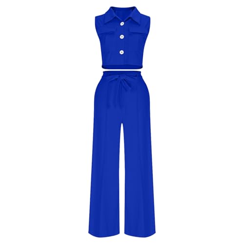 Womens Vest Sets Summer 2 Piece Outfits Sleeveless Lapel Button Crop Blazer Tank Top and Wide Leg Belted Pants Suits