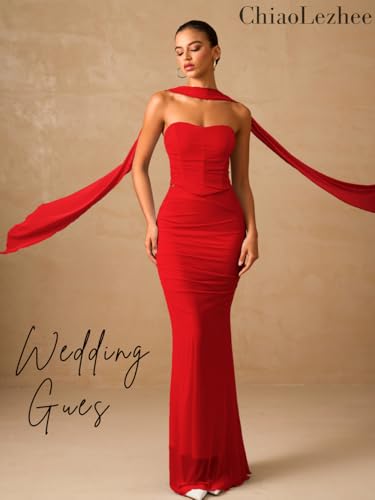 trending ! Mesh Floor-Length Skirt-Set, Corset Tube-Top with Scarf, Semi-Formal Wedding-Guest, Strapless Bodycon Ruched Long