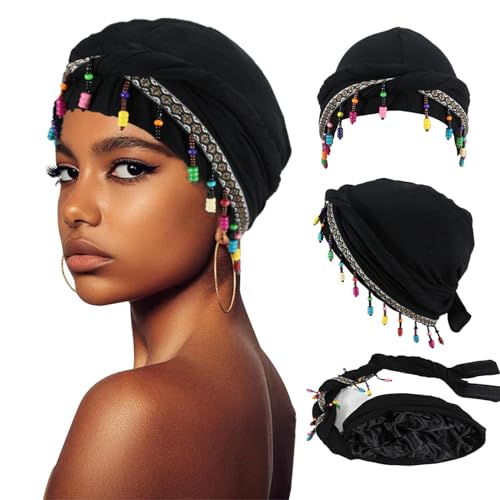 Turban Hats for Women Girls Beaded Tassels African Head Wraps Satin Lined Turban Durag Twisted Braid Bonnet Hair Wrap