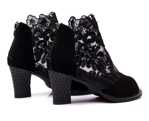 • Open toe high heels sandals feature a traditional pure black with strong chunky medium heels, sexy and breathable lace flower upper; this summer boots sexy and plush, mesh upper enhances breathability to ensure the feet stay dry and comfortable.