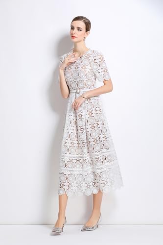 trending ! LAI MENG FIVE CATS Women's Flowy Lace Floral Hollow Out Short Sleeve Dress with Belt