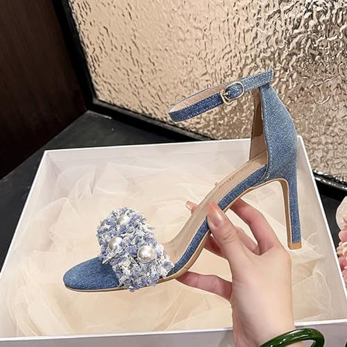trending ! WENOREG Women's Rhinestones Pearl Open Toe Ankle Strap Stiletto Sandals,Summer Adjustable Ankle Strap Denim High Heels Bride Wedding Party Dress Shoes