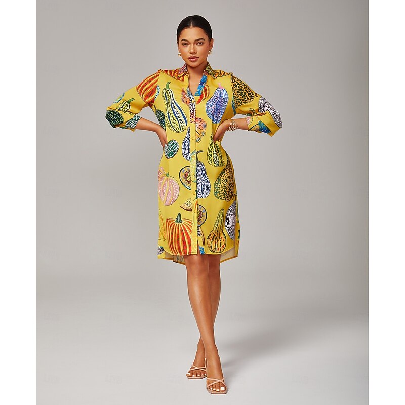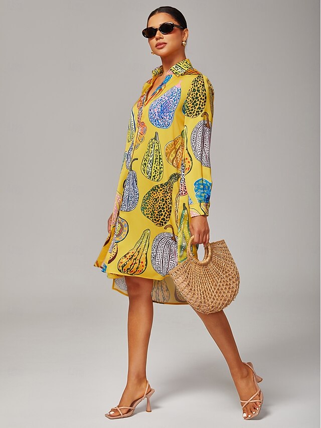 Why Choose Women's Shirt Dress Casual V Neck Asymmetrical Hem Split Design Pumpkin Print Yellow?