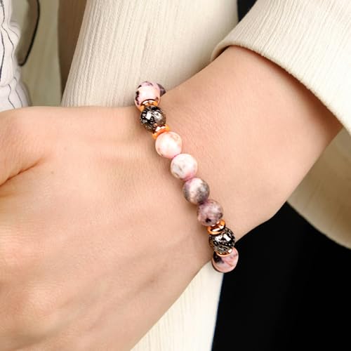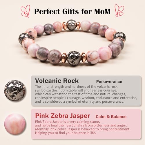 Material: StoneMetal type: AlloysClasp type: Elastic cordGem type: No gemstone【BEST GIFT FOR MOM】This bracelet is a combination of pink zebra moonstone and volcanic stone. Pink Zebra Moonstone can give mom energy, purify stress or anxiety and bring her love and protection. This women's bracelet is perfect as a distinctive Mother's Day gift for mom from her daughter's son, a perfect gift for mom.【UNIQUE DESIGN AND EXCELLENT CRAFTSMANSHIP】Each bead is a natural gemstone carefully selected by hand one by one, containing infinite energy. A moral card specially designed for mom is included to make sure your gift is full of love for your mom. Solid craftsmanship ensures that it is super comfortable to wear on a daily basis and will not easily fall off or come apart. This meaningful natural stone bracelet can be worn and protected for her for a long time.【EXCELLENT PACKAGING, GREAT GIFT】This bracelet is carefully packaged with eco-friendly materials. The included information card not only expresses your love for your mom, but also details the functions of moonstone, making your gift more thoughtful. This bracelet is a Mother's Day gift for mom from daughter, Mother's Day gift for mom from son, unique birthday gift for mom, I love you gift for mom, Thanksgiving gift, Thanksgiving gift, Valentine's Day gift and Christmas gift for mom.STRETCHY CORD DESIGN, SUITABLE FOR MOST WOMEN】This bracelet is made of stretchy cord, which can be stretched and telescoped to fit most women's wrists, comfortable and tight to wear, no need to worry about the size. It is very easy, elegant and simple to wear and take off.【24 HOURS ONLINE AFTER-SALES】Our products will be checked before sending out to make sure there is no problem, but due to manual inspection, there will inevitably be omissions. Any quality problems, you can contact us, we are 24 hours online to solve your problems. Perfect for everyday use. premium materials and excellent craftsmanship ensure long-lasting durability.