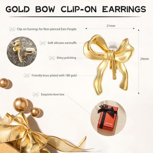 Material: SiliconeMetal type: CopperBack Finding: Clip OnEarring design: Non PiercedGem type: No GemstoneItem type name: Clip On Earrings【Clip-on Gold Bow Earrings】LOFITOR has selected="" several popular bow elements and specially designed ear clips for non-pierced ears, allowing everyone to showcase the fashionable beauty brought by gold bow jewerly【Excellent Quality】The gold bow ribbon earrings are made of superior brass and plated with 18K gold, are hypoallergenic earrings. The reliable materials give bow earrings a long-lasting luster【snug to Wear】This gold clip-on earrings adopts a lightweight design and add soft silicone earmuffs at the clip to improve the wearing experience,suitable for you to wear it all day【Perfect Accessory】The bowknot statement earrings comes in multiple styles to choose from, ribbon bow, snake chain bow,tie bow, pearl bow, CZ bow and so on. You can wear them on any occasion, such as concert, party, travel, wedding, work. Wearing gold bow earrings will not only make your whole outfit stand out and attract everyone's attention【Ideal Present】The gold bow earrings with a exquisite bow box are your ideal choice for perfect present. Suitable for yourself ,your lover, friends,family on Wedding,Valentine's Day, Anniversary, Graduation, Birthday, Mother's Day and Christmas.Purchasing this present will make your special moments even more memorable【Service/Daily Care】Quick customer service with satisfactory and patient reply within 24 hours.To extend the life of your high quality costume jewelry, avoid exposure to cleaning agents, beauty products & water. Store it in a cool, dry place and wear it with love Perfect for everyday use. High quality materials and excellent craftsmanship ensure long-lasting durability.