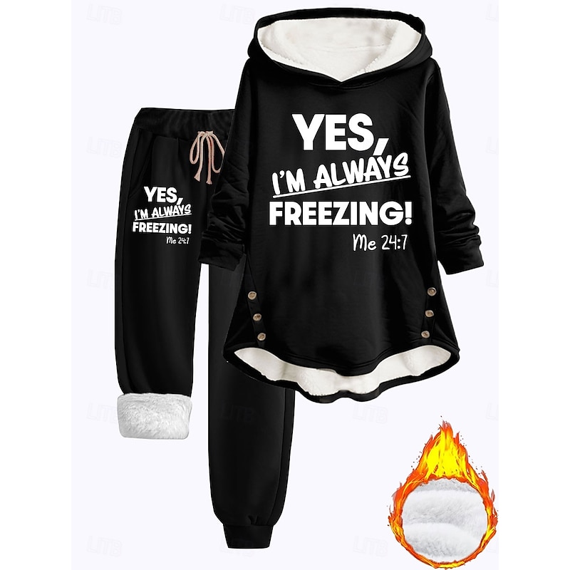 trending ! Women's 2 Pieces Loungewear Set Hoodie and Joggers Casual Cold Weather Phrase Print with Fleece Lining Cozy Fit Winter