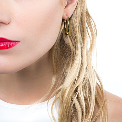 Item display length: 1.25 inchesItem width: 0.06 inchesMaterial: MetalMetal type: Gold-plated-baseBack Finding: Hinged HoopEarring design: HoopThese enduring ear rings with hypoallergenic surgical steel posts are Made To Last with up to 20X more 24 karat real gold plating than standard plated fashion jewelry; Choice of gold or white Gold (rhodium)Made by a small family run business since 1987; Diameter: 1.25mm; Comes in a black velvet pouch for easy giving; Safe for sensitive ears; Easy to put on with long postsLifetime Jewelry is the Next best thing to solid gold, You can get ten of ours for every piece of 14k or 18k you buyMake a statement with this cute and dainty set of earrings for women; Matches with a boho rose blouse, cool black leather boots and chunky steel cuffs; Accessorize it with a feather or a flower tucked behind your ear and wear it with confidence, as not even your jeweler will know these are not solid goldLifetime Replacement; Lifetime Jewelry is not just jewelry - it’s our commitment to you for a lifetime; Be it 30 days, a year or a decade - you’ll get new studs from us if ever any of our earrings break, fade, or simply don’t live up to your highest expectations; Just remember to register your purchase(s) Perfect for everyday use. superior materials and excellent craftsmanship ensure long-lasting durability.