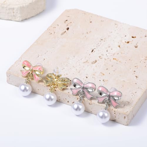 More information about Gold Bow Earrings for Women Pearl Bow Earrings Trendy Pink Drop Stud 2 Pairs Ribbon Silver Earring Dangle Jewelry Long Tassel Chain Drop Earring Bowknot Stud Wedding Party Daily Accessory Gifts