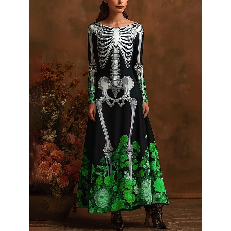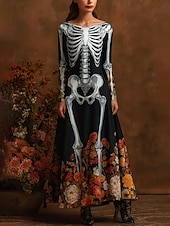 More information about Halloween Women's Skeleton Maxi Dress Sheath Dress A Line Dress Casual Boho Wedding Guest Beach Regular Fit Floral Graphic Long Sleeve Crew Neck Boat Neck Blue Purple Orange Green Spring Fall Winter