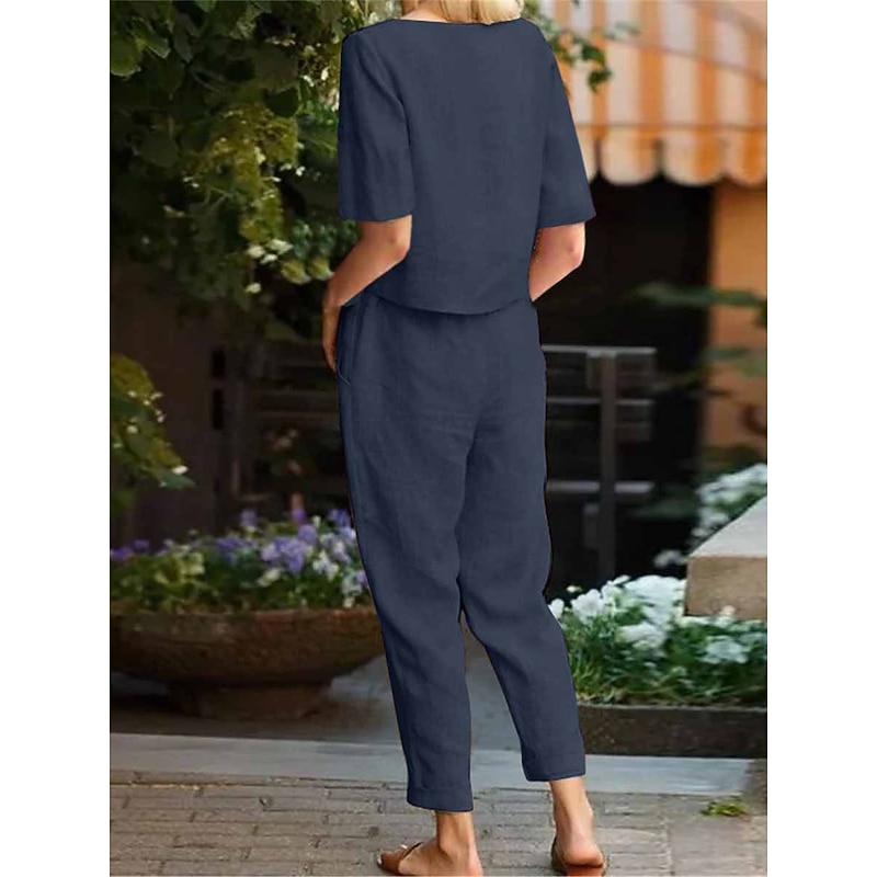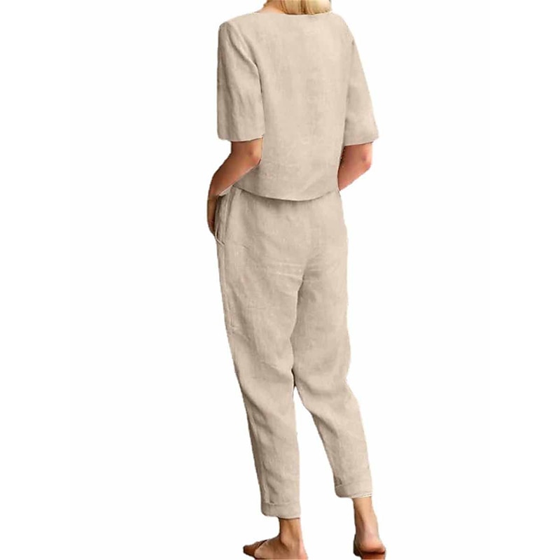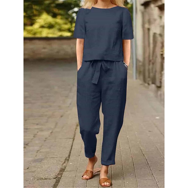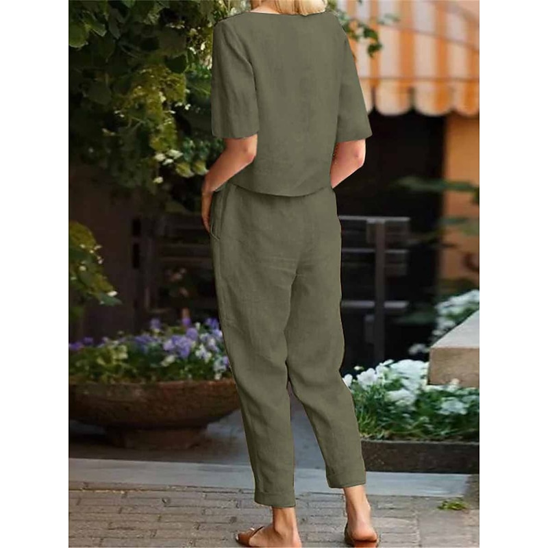 Why Choose Women's Loungewear Two Piece Sets Fashion plain Casual Pure Color Pocket Cotton Linen Sets T Shirt Pant Street Date Airport Half Sleeve Crew Neck Army Green Orange Khaki Dark Blue Summer Spring?