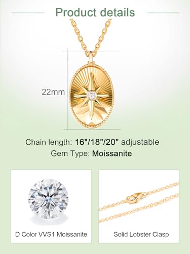 Item display length: 20 inchesItem width: 0.51 inchesMaterial: Sterling SilverMetal type: Sterling SilverClasp type: LobsterChain type: Cable【Simple North Star Necklace】- Our 14k gold plated pendant necklace, featuring an exquisitely crafted oval design with a dazzling D color moissanite and north star at its heart. Timeless and elegant, this north star necklace embodies the essence of minimalist beauty, making it a wonderful choice for both special occasions and everyday wear.【Extraordinary Moissanite】- These D color VVS1 clarity moissanites offer brilliance and fiery that surpasses diamonds. All of them are created in a laboratory, ethical and can pass the diamond test easily, making them a budget-friendly pick for buyers looking for excellent jewelry.【Exquisite Craft】- Made from 925 sterling silver with rhodium plated surface to ensure hypoallergenic and won't harm your skin. With its excellent shine and tarnish resistance to maintain its sparkle for a long time, you will receive many compliments every time you wear it.【Delicate Gift】- Beautifully packaged in a velvet gift box. Ideal gift for your lover, family, or friends, whether you're celebrating a Birthday, commemorating a Anniversary, Christmas or expressing your love on Valentine's Day.【Worry-Free Customer Support】- Your satisfaction is most important to us, we offer 90 days money back and exchange guarantee, if you have any questions, please feel free to contact us by email, we will respond within 24 hours. Perfect for everyday use. premium materials and excellent craftsmanship ensure long-lasting durability.