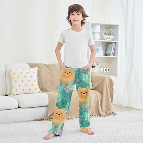 Lovely Pomeranian Florals Boys Long Pants supple Trousers Elastic Waist Kids Lounge Bottoms with Pockets S-XL