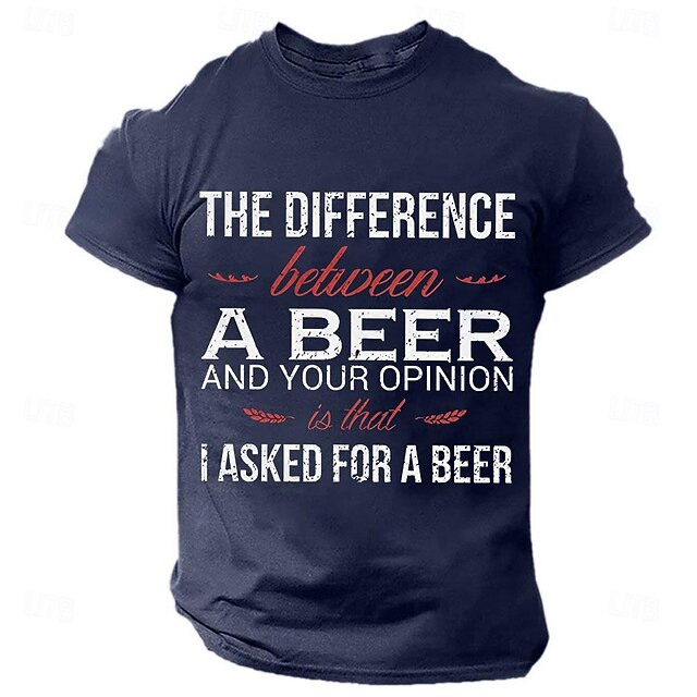 Highlights [Fabric] : Crafted from high-quality, 100% cotton, this men's t-shirt ensures comfort and breathability, making it an excellent choice for warm-weather wear. The durable and soft fabric is perfect for maintaining ease throughout the day. [Fit Type] : Featuring a regular fit, this t-shirt provides a comfortable and enduring silhouette suitable for a wide range of body types. The standard crew neckline and short sleeves offer a timeless look, while the micro-elasticity ensures a flexible and relaxed fit. [Design Highlights] : The shirt boasts a humorous letter print with the witty slogan, The difference between a beer and your opinion is that I asked for a beer. This playful design is presented in contrasting white and red colors against a navy blue background, creating a bold and eye-catching effect. [Occasions] : Ideal for a variety of casual settings, this t-shirt can be worn for street style, outdoor activities, sports events, or social gatherings. Its humorous and laid-back design makes it a great choice for those who enjoy expressing their personality through their clothing. [Size Range] : Available in a range of sizes from S to XXL, this t-shirt accommodates various body types, ensuring a suitable fit for a broad audience. Perfect for everyday use. superior materials and excellent craftsmanship ensure long-lasting durability.