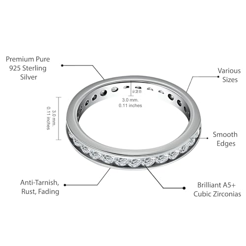 Ring size: 5Material: MetalMetal type: Sterling SilverGem type: Cubic ZirconiaSOLID 925 STERLING SILVER – We Design and Manufacture Premium 925 Sterling Silver Jewelry In-House, within Our Own Manufacturing Facility for Unmatched Craftsmanship & Superior Quality. Our Sterling Silver Wedding Rings for Women: %100 Hypoallergenic, Safe for Sensitive Skin. Nickel, Lead, Cadmium-Free with Anti-Tarnish Coating for Lasting Brilliance.DAZZLING ETERNITY RING – Exquisite 925 Sterling Silver 2mm Eternity Band, Featuring a Continuis Row of Channel Set Highest Graded A5+ Round-Cut Cubic Zirconia Stones, Offering the Sparkle and Clarity of Real Diamonds.COMFORT FIT DESIGN – Expertly Crafted with a Smooth, Comfort Fit Interior, this Women Stackable Eternity Ring is Perfect for Daily Wear. Available in sizes 5-10. Three Sterling Silver Finishes: Classic Silver, Luxurous Yellow Gold & Warm Rose Gold.GIFT-READY PACKAGING – Your Order is Carefully Hand-Picked and Hand-Packed, Comes with a Stylish Jewelry Gift Pouch Ready for Gifting. Our Sterling Silver Rings for Women are Perfect for Birthday, Graduation, Anniversary, Christmas, Hanukkah, Mother’s Day, Father's Day, Valentine’s Day, Prom and Graduation.PROUDLY NYC-BASED – Hoops & Loops, both Designers and Manufacturers, Proudly Based in New York, Crafts Premium Sterling Silver Jewelry that Blends Urban Chic with Uncompromising Quality Directly from the Source. Perfect for everyday use. High quality materials and excellent craftsmanship ensure long-lasting durability.