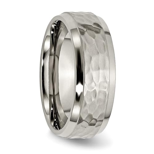 Ring size: 7Material: MetalMetal type: TitaniumGem type: No GemstonePRODUCT SPECIFICATIONS : Titanium Polished and Hammered 8mm Beveled Edge Band Ring Size 7, Finish:Polished|Band Width:8mm|Material: Titanium|Ring Fit:Comfort|Sizeable:No|Thickness:< 2.5mm|Width of Item:8mm|Engravable:Yes|Sold By Unit:Each|Texture:Hammered|Material Color:Grey|Ring Type:Wedding Bands|Edge Type:BeveledTIMELESS DESIGNS : Our jewelry collection features timeless designs that transcend fleeting trends. From delicate and minimalistic pieces to bold and statement-making accessories, each design is carefully crafted to maintain a classic and enduring appeal. These jewelry pieces effortlessly elevate any outfit and can be enjoyed for years to come.LUXURY GRADE : Our jewelry collection incorporates only the finest materials available. This includes the use of high-quality precious metals such as 10K and 14K Gold, Platinum and Sterling Silver which are sourced exclusively. Gemstones of the highest Caliber, such as Diamonds, Rubies, Sapphires, and Emeralds are meticulously selected for their exceptional Color, Clarity and Brilliance.ASSURED PURCHASES : Buying from Auriga Fine Jewelry means a promise given to the customer while purchasing the jewelry item that they can trust and believe in the Quality, Authenticity and the Value of the Jewelry they are purchasing.LUXURY GIFT PACKAGING : Our luxury gift packaging is the perfect way to make your family members feel special on their birthdays, to celebrate the love and commitment of an anniversary, or to honor the beautiful bond you share on any occasion. Perfect for everyday use. High quality materials and excellent craftsmanship ensure long-lasting durability.