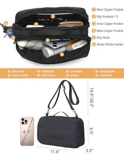 Origin: ImportedClosure type: ZipperLining: Polyester[Water Bottle Storage Space]: This water bottle sleeve can hold a variety of bottles up to 40oz (NO Handle)Base Width: ≤4. The opening of the water bottle compartment is equipped with an elastic rope to protect your water bottle from falling out of the pocket while you exercise. Of course, this pocket can also be used to store an umbrella or collapsible trekking poles, freeing your hands for outdoor activities like hiking or sports.[Splash-Resistant Fabric & Lightweight Material]: This puff crossbody purse is made of water-resistant nylon fabric with cotton padding, making it featherlight and soft. Even when carried for long periods, it won’t cause fatigue. Additionally, the material is easy to clean—if it gets dirty, simply wipe it gently with a damp cloth or tissue, and it will look as good as new.[Multi-pocket Design]: In addition to a hidden water bottle pocket, this cross body bag features 2 main zippered compartments to help you neatly organize your personal belongings, such as lipstick, phone, wallet, sunglasses, and more.[Measurements]: The size of water bottle carrier bag is 11.6 x 3.3 x 6.5 (L x W x H). This cross over water bottle bags come with adjustable straps ranging from 15 to 28 in length, It can be used as a crossover purse or one shoulder bags to fit your body activity when you participate in various activitie.[Versatile for Everyday Use] This fashionable over the shoulder bags is perfect for walking, yoga, biking, camping, hiking, commuting, or even if you're at the beach, and other outdoor activities. The trendy quilted puffy side bag is the perfect gift for girlfriend, wife, and mother on any occasion like Christmas, New Year, Valentine's day, birthday, and anniversaries. It is suitable for a variety of styles of clothing. Perfect for everyday use. premium materials and excellent craftsmanship ensure long-lasting durability.