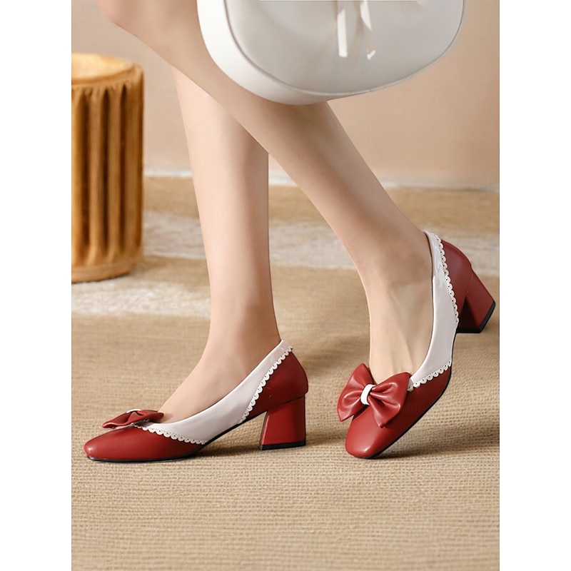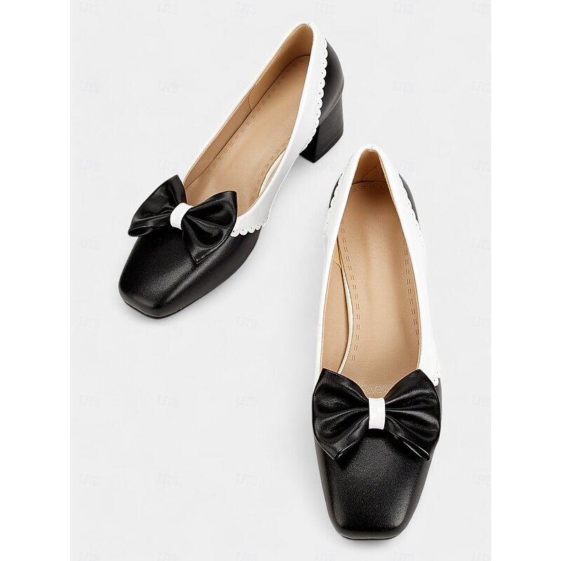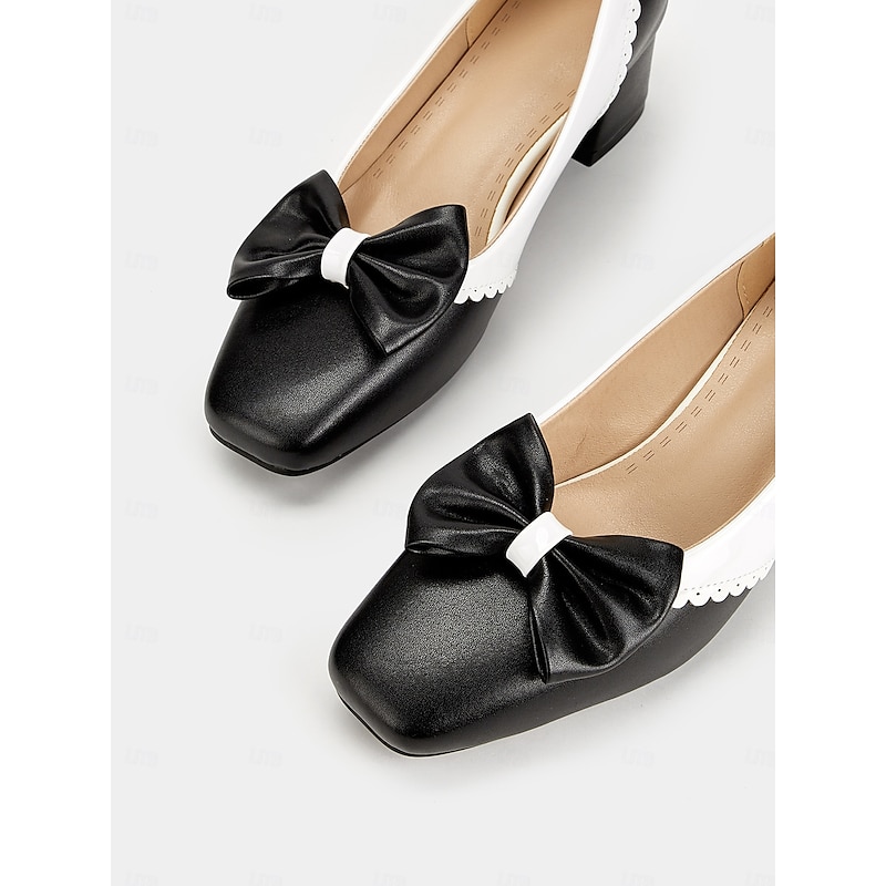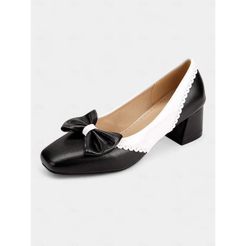 Highlights [Fabric & Materials] Crafted from high-quality faux leather, these pumps feature a PU upper and synthetic leather lining, providing a sleek and polished appearance. The foam rubber outsole ensures durability and stability, combining style with function. [Design & Features] Embracing a vintage-inspired design, these black and white pumps showcase a charming bowknot detail on the front. The timeless round toe shape and scalloped edges add a feminine touch, while the block heels offer a perfect balance between elegance and comfort for any occasion. [Styling & Versatility] Whether you're heading to the office, a casual outing, or a dressy event, these versatile pumps seamlessly complement both professional and casual ensembles. Their chic design makes them an ideal addition to any fashion-forward wardrobe, suitable for all four seasons. [Occasions & Uses] Perfect for daily wear, these shoes are designed to provide comfort throughout the day. Their versatile style and cozy construction make them an excellent choice for spring, summer, fall, and winter, ensuring you look fashionable year-round. [Size Guide & Suggestions] Available in sizes ranging from US5.5 (EU35) to US10.5 (EU42), these shoes are designed to fit standard measurements. It is recommended to select your usual size for the best fit.