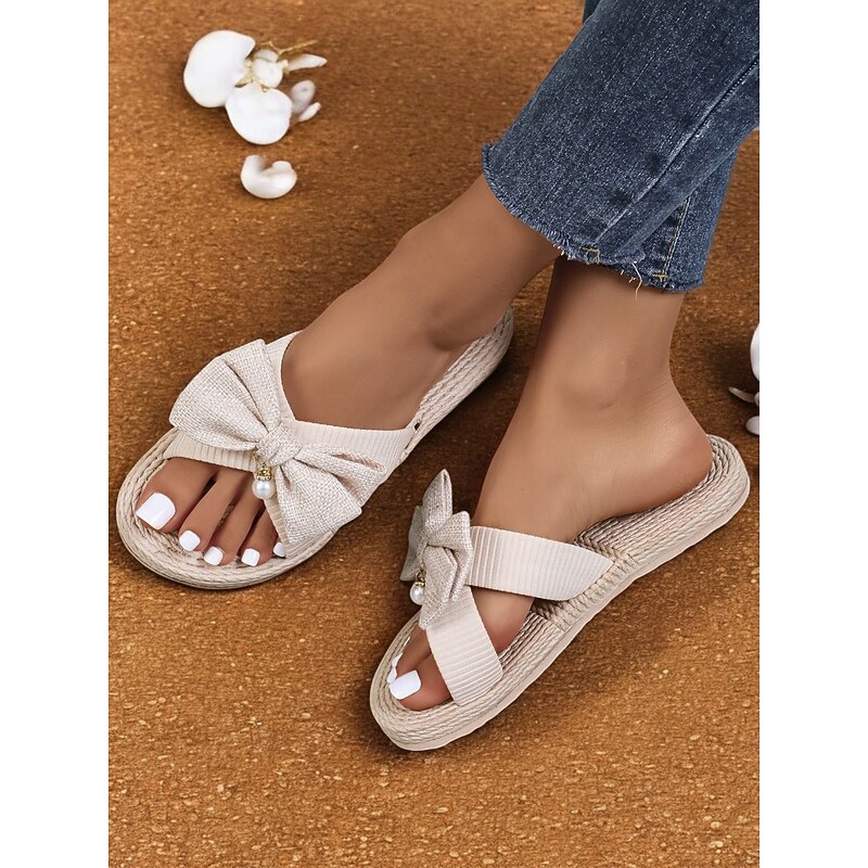 trending ! Women's Black Bowknot Espadrille Flat Sandals with Pearl Detail - fashionable Summer Slip-Ons for Casual Outings and Beachwear