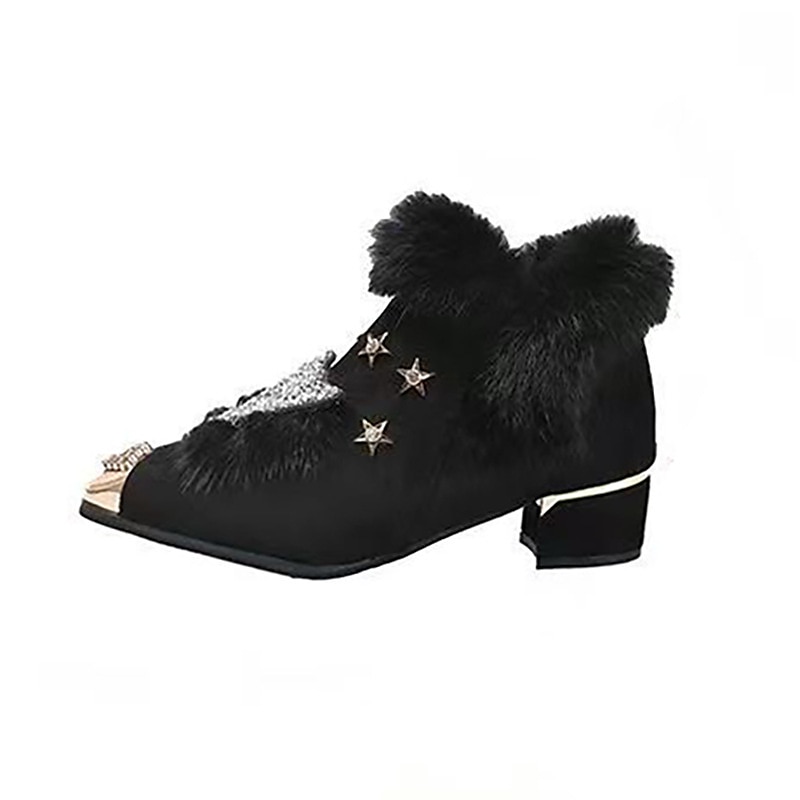 Highlights [Fabric and Material] : Crafted with premium synthetic materials, these ankle boots feature a luxurious suede-like upper that exudes elegance. The soft, plush faux fur trim around the ankle adds a layer of warmth and texture, making these boots ideal for colder seasons. [Fit and Style] : Designed with a pointed toe and a sturdy chunky heel, these boots offer a sophisticated yet comfortable fit. The block heel provides excellent stability, making them perfect for long wear during both casual outings and dressier occasions. [Design Highlights] : A standout feature of these boots is the intricate embellishments, including sparkling rhinestones and metal star-shaped decorations, which add a touch of glamour. The metallic accents on the pointed toe cap contribute to the up-to-date and chic aesthetic. [Occasions] : Perfect for daily wear and outdoor activities, these boots are versatile enough to complement various outfits during fall and winter. Whether attending a casual meet-up or a formal gathering, they are the perfect addition to elevate your ensemble. [Size Range] : Available in a wide range of sizes, from 35 to 42, ensuring a comfortable fit for different foot sizes. Perfect for everyday use. superior materials and excellent craftsmanship ensure long-lasting durability.