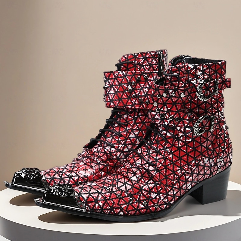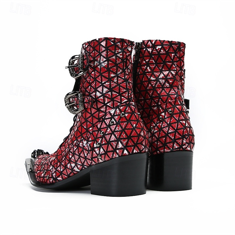 Why Choose Men's Red Genuine Leather Punk Ankle Boots with Geometric Pattern and Double Buckle Straps, 100% Cowhide Western Style Boots for Stage and Nightclub Fashion?