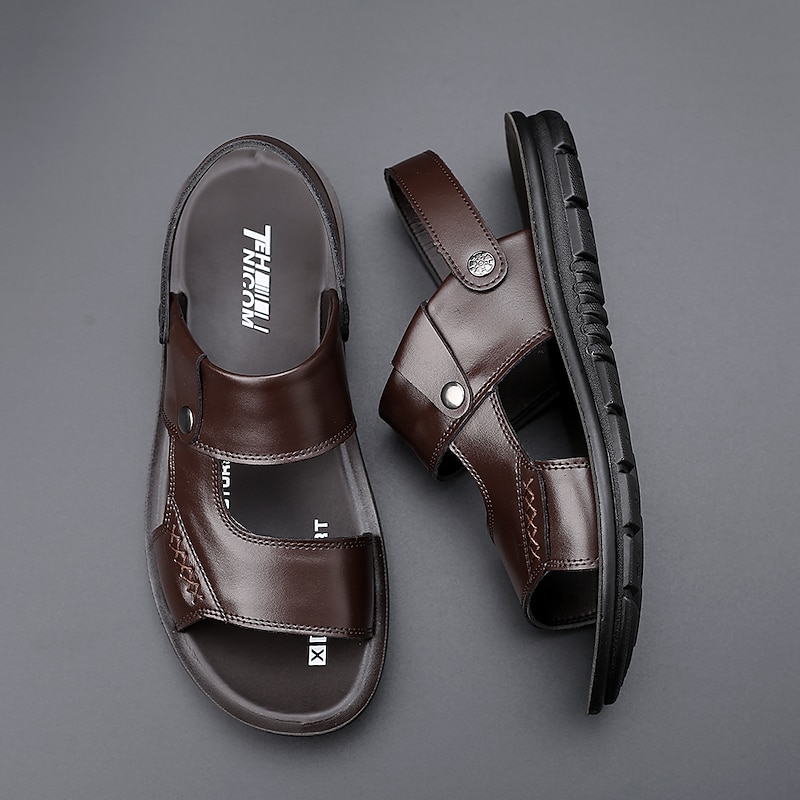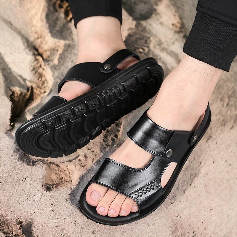 Highlights - DUAL-USE DESIGN: These men's slide sandals come with a rotatable heel strap that allows for easy conversion between sandals and slippers to fit any occasion. - WATER-RESISTANT & LIGHTWEIGHT: Made with water-resistant materials and lightweight construction, these men's sandals are perfect for all kinds of outdoor activities. - SOFT & COMFY: The open-toe design combined with soft microfiber leather provides ultimate comfort and durability, keeping your feet cozy all day long. - ANTI-SLIP: The wide and flexible polyurethane outsole with concave-convex texture offers excellent anti-skid performance, ensuring added stability and shock absorption. - CUSHION & SUPPORT: Featuring a broad microfiber leather footbed with arch support, these sandals provide maximum comfort with every step, supporting your feet and preventing irritation or chafing. - DAILY ESSENTIAL: With a fashionable dual-purpose design, these men's beach sandals are a summer essential, perfect for exploring new towns, lounging by the pool, or enjoying a day at the beach. - PREMIUM MATERIALS: Made with high-quality cowhide, these sandals are built to last and provide a fashionable, sophisticated look. Perfect for everyday use. premium materials and excellent craftsmanship ensure long-lasting durability.