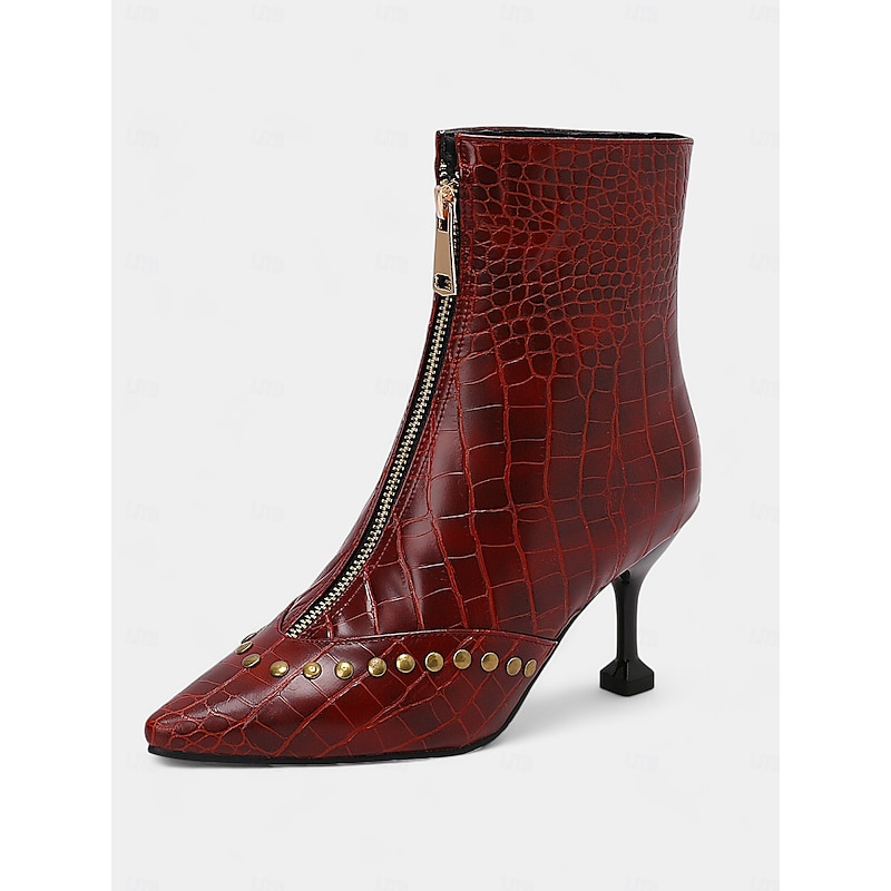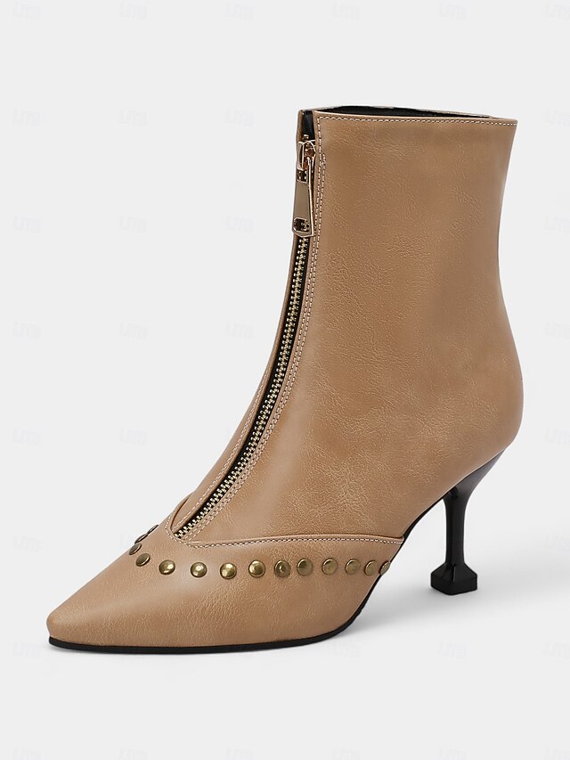 : Featuring a side zipper closure, these boots provide ease of wear and removal, adding a present-day touch to their classic look. The decorative metal studs along the front offer a trendy and fashionable appeal, enhancing their overall aesthetic.
