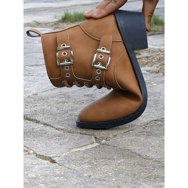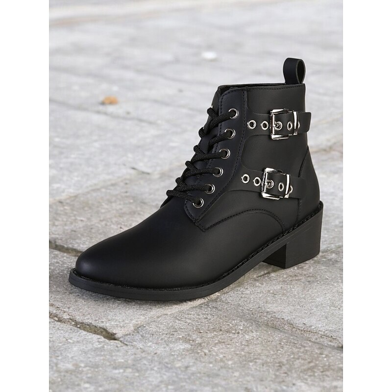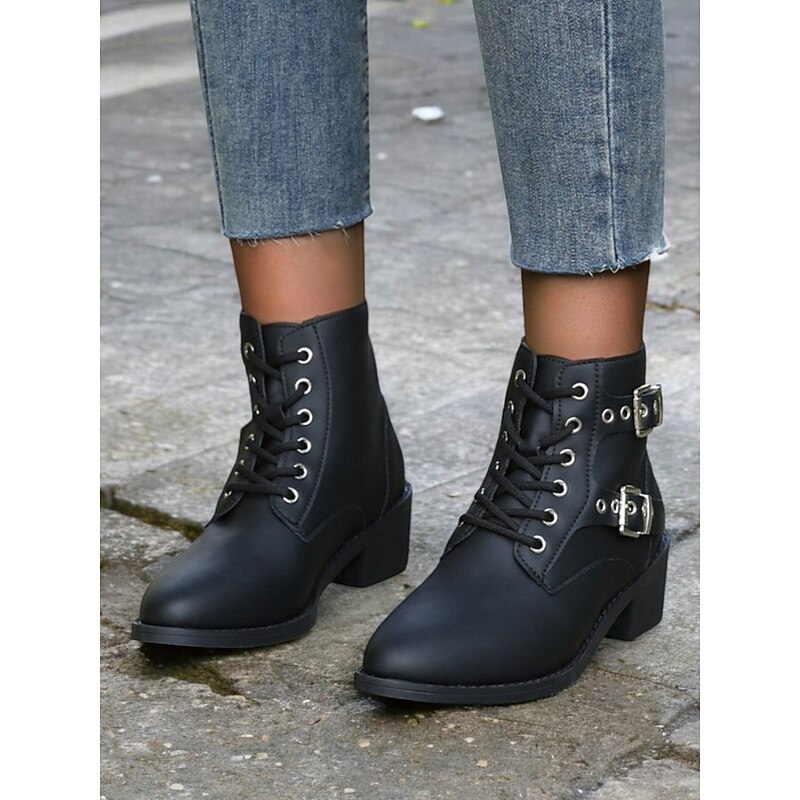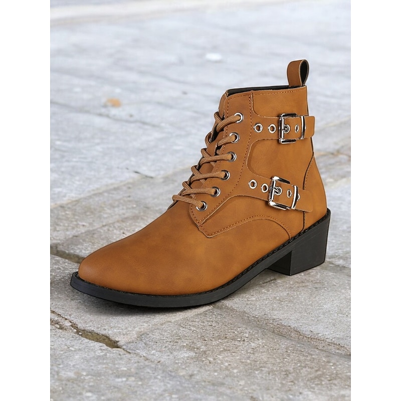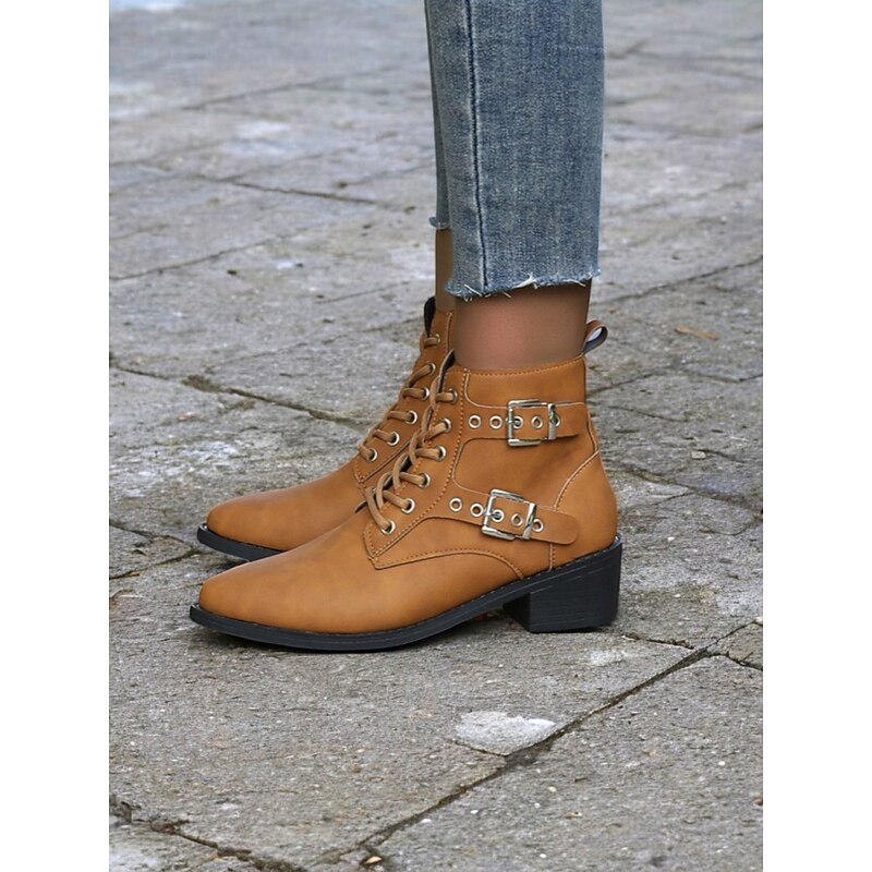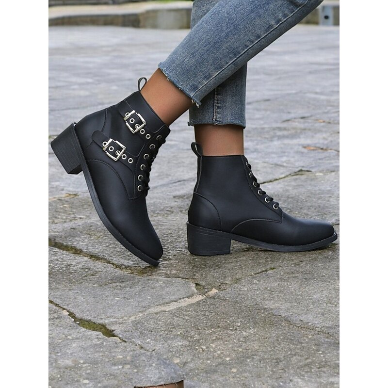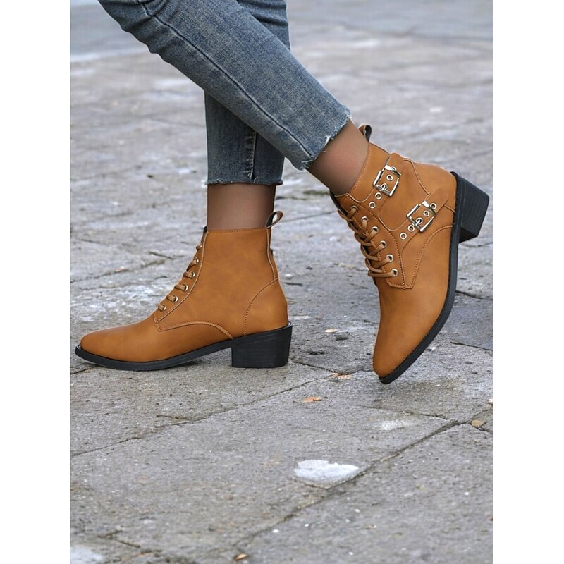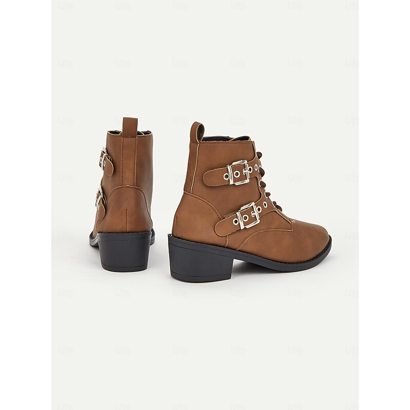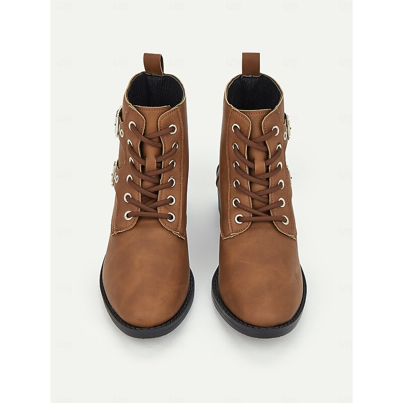 Highlights [Fabric] : Expertly crafted from high-quality PU, these ankle boots feature a durable faux leather upper, offering both elegance and resilience. The textile lining provides a soft and warm touch, suitable for cooler seasons. [Fit] : Designed with a comfortable low block heel and a rounded toe, these boots ensure ease of wear throughout the day. Their chunky heel provides stability, making them an ideal choice for daily and work outings. [Design Highlights] : These contemporary brown ankle boots boast a rugged yet sophisticated look with a lace-up front and dual silver buckle straps, adding a hint of edginess. The versatile design is completed by a sleek, smooth finish and a up-to-date combat boot style. [Occasions] : Perfect for everyday casual wear and office settings, these boots add a fashionable edge to your wardrobe. Ideal for spring, fall, and winter, they complement both casual and semi-formal outfits, providing versatility and chic style. [Size Range] : Available in sizes ranging from US6 / EU36 / UK4 / CN36 to US10.5 / EU42 / UK8.5 / CN43. Standard size recommendations suggest selecting your usual size for the best fit.