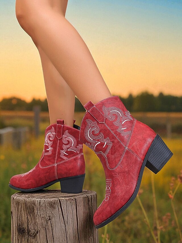 Why Choose Women's Red Faux Leather Western Cowboy Ankle Boots with Embroidered Stitching, Chunky Low Heel Rodeo Booties for Casual Outfits & Country Concerts?