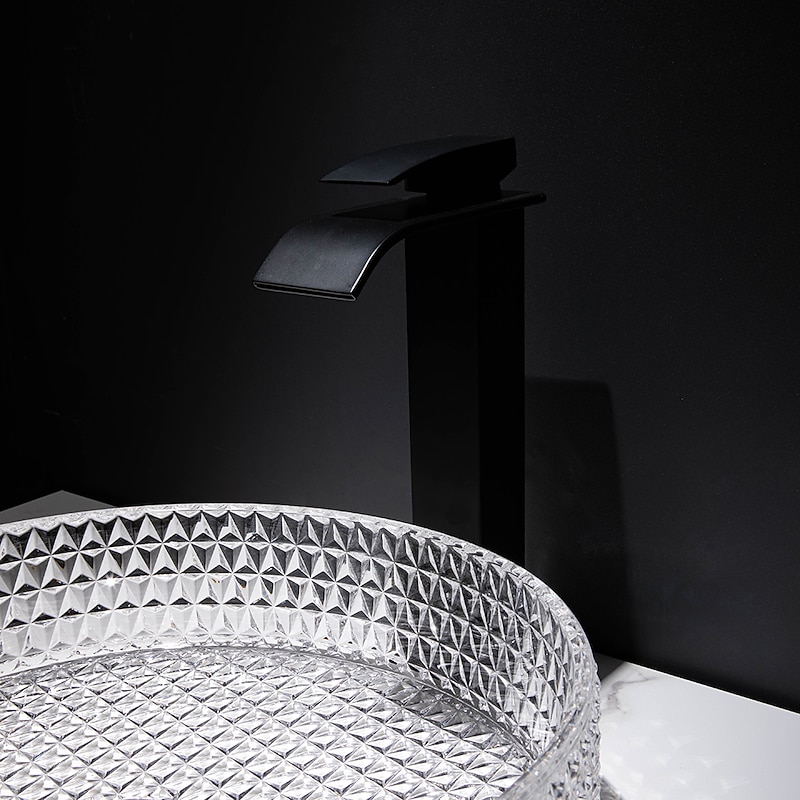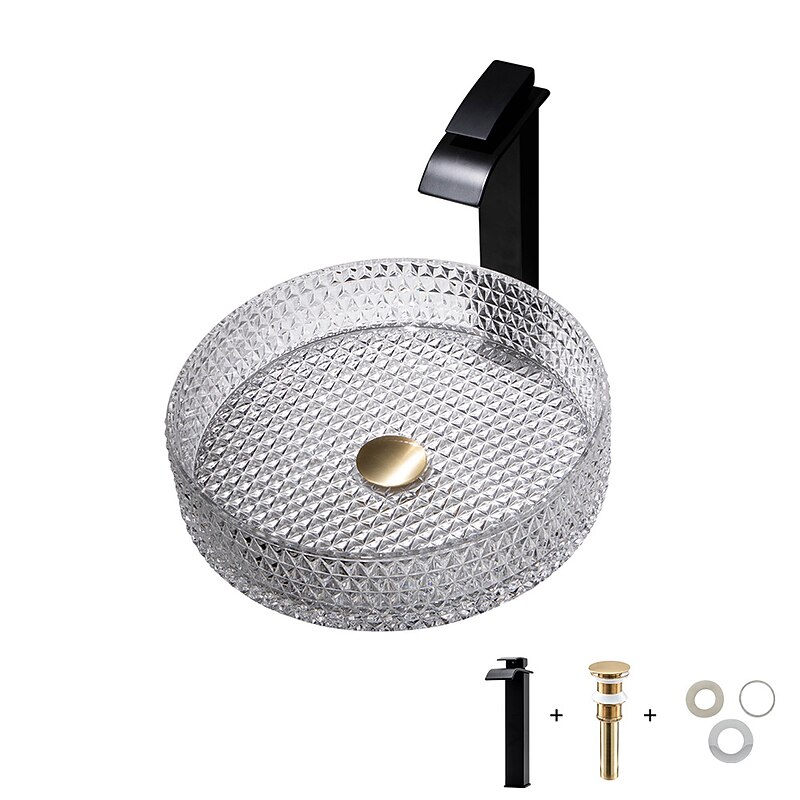 trending ! Bathroom Vessel Sink with Black Faucet, contemporary Clear Tempered Glass Basin with Pop-Up Drain, Artistic Round Basin Bowl Set, Above Counter Vanity Sink