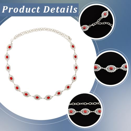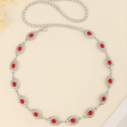 Red Turquoise Oval Chain Western Cowgirl Metal Silver Sparkly Adjustable Summer Belly Chain Link Belts Fashion Belt Jewelry Accessories for Women Dress Wedding Bridal Party Birthday Club