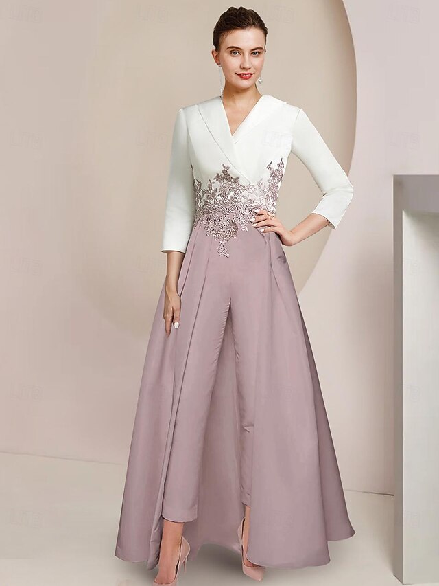 trending ! Jumpsuit Mother of the Bride Formal Wedding Guest Elegant Party V Neck Ankle Length Crepe Lace 3/4 Length Sleeve with Appliques Color Block