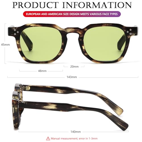 Origin: ImportedNOTE: This retro sunglasses is unisex, the size is slightly narrow, heavy about 32g, if you have a big head, wearing it may feel a little tightly on your face, not suitable for wide faces. So please purchase with cautionTRENDY RETRO SUNGLASSES: The retro square thick frame sunglasses with three-point metal rivets, legs are thoughtfully designed with non-slip stripes to ensure that we look sleek and have a comfortable fit at the same time, embrace the timeless appeal of retro fashionUV400 PROTECTION SUNGLASSES: These simple square sunglasses can block 100% harmful UVA, UVB rays, protect your eyes against long term UV damage. High-Definition Lens Gives you a Natural & Clear Vision, and keeping your eyes healthyGIFT IDEAS FOR FRIENDS AND FAMILY: These retro 90's square sunglasses are carefully inspected and carefully packaged, so It is also a gift packaged ready, making it a wonderful yet practical gift idea for friends and familyPRODUCT AND CUSTOMER SERVICE: In case any accident of the shipping or unexpected damage happened to these thick frame sunglasses. Please contact us without hesitation, we will reply within 24 hours to solve the problem Perfect for everyday use. superior materials and excellent craftsmanship ensure long-lasting durability.