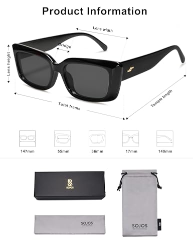 Origin: ImportedCLASSIC RECTANGLE FRAME FOR EVERYONE - These timeless fashion sunglasses will bring you a timeless look and will be great choices for daily fashion accessories all year round. They are suitable for both men and women and suitable for any occasion and weather conditions.UV400 PROTECTION PC LENSES - SojoS premium quality polycarbonate lenses can filter out sunlight reflected glare and protect your eyes from long term damage by blocking harmful UVA and UVB rays.HIGH RESISTANT MATERIALS - These SojoS rectangle sunglasses are made of high resistant plastic frames, UV400 PC lenses, solid metal hinges. All the details will ensure you a long time using.PRODUCT DIMENSION - Lens Width: 55mm | Lens Height: 36mm | Temple Length: 140mm | Nose Bridge: 17mmGIFT IDEAS PACKAGE - Sunglasses*1, microfiber pouch*1, microfiber glasses cleaning cloth*1, glasses box*1. These are also gift packed, which will be great gifts for your friends and family! Perfect for everyday use. premium materials and excellent craftsmanship ensure long-lasting durability.
