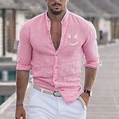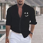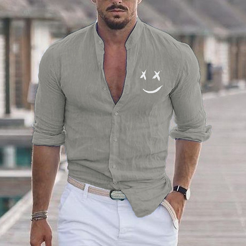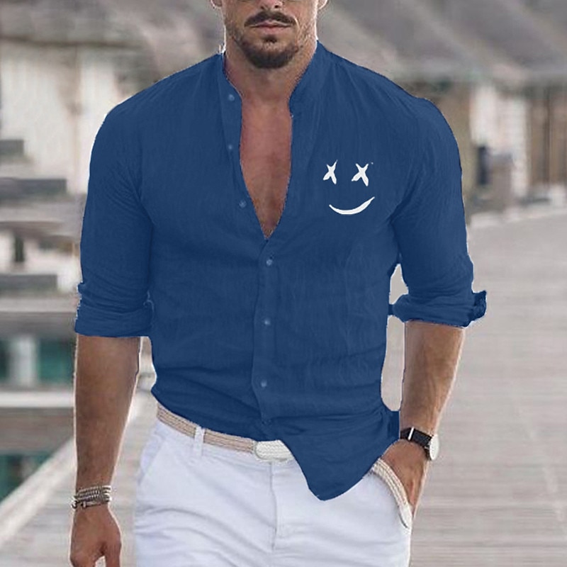 Highlights [Fabric] : Crafted from a blend of Cotton and Polyester, this men's shirt offers a lightweight and breathable feel, ensuring comfort during both spring and fall seasons. The fabric is durable and easy to maintain, allowing for both washable and wet/dry cleaning. [Fit] : Designed as a regular fit, this shirt provides a balance of comfort and style, fitting well without being too tight or too loose. The tailored silhouette complements a variety of body types. [Design Highlights] : Featuring a stand collar and classic button-down closure, the shirt is both modern and versatile. Long sleeves with roll-up cuffs add a relaxed yet refined touch, and the one-of-a-kind emoji face print gives it a playful vibe. Available in a range of colors β Blue, White, Black, Red, Pink, and Gray β it can match diverse personal styles. [Occasions] : Perfect for vacations, daily wear, or outdoor events, this beach shirt is an excellent choice for casual or semi-formal occasions. Whether paired with denim for a casual day out or chinos for a night out, it adds a touch of flair to any outfit. [Size Range] : Available in sizes S, M, L, XL, 2XL, and 3XL, the shirt caters to a wide range of body sizes, ensuring that every man can find his perfect fit. Perfect for everyday use. premium materials and excellent craftsmanship ensure long-lasting durability.