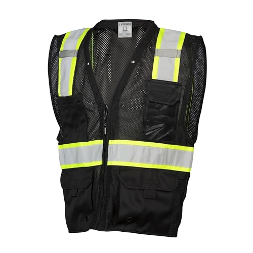 trending ! Kishigo Black Enhanced Visibility Men's Vest B100, Multi Pocket Mesh Hi-Vis Vest, Ultra-Cool Polyester, 6 Pockets, Zipper