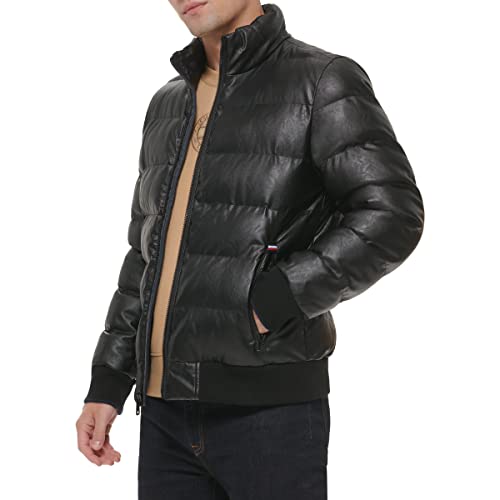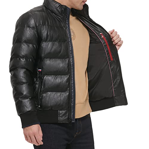 trending ! Tommy Hilfiger Mens Tommy Hilfiger Men's Midweight Quilted Faux Leather Bomber, Black, Small