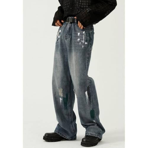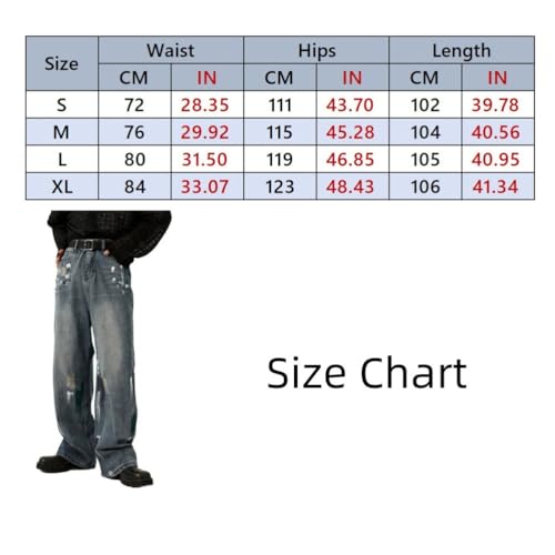 Fabric type: 100% Polyester & Polyester BlendCare instructions: Machine WashOrigin: ImportedClosure type: BuckleDurable Denim: Made from high-quality denim, it's durable and retains its shape, yet maintains a soft feel for a variety of activities.Features: Retro street-style jeans with ripped, washed, and irregular prints, featuring a unique design for a more sleek look on the streets.Occasions: These loose-fitting jeans are versatile and perfect for school, dates, casual hikes, parties, streetwear, outdoor activities, and casual everyday wear.Pairing: These jeans can be worn year-round, pairing them with hoodies, sweaters, simple T-shirts, jackets, sneakers, sandals, and more.Warm Tips: These men's ripped retro street-style jeans are recommended for hand or machine washing. Do not bleach; please refer to the size chart before ordering. Perfect for everyday use. superior materials and excellent craftsmanship ensure long-lasting durability.
