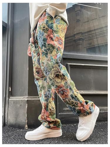 trending ! Men's Vintage Floral Straight Leg Baggy Pants Drawstring Waist Trousers with Pockets Streetwear