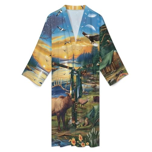 Wildlife Deer Bear Eagle Funny Men's Robe Novelty silky Lightweight Bathrobe Long-sleeve Spa Robes