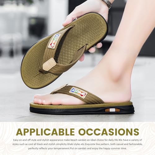 Sole material: Synthetic RubberOuter material: Denim fabricClosure type: Slip OnWater resistance level: Water Resistant【Comfortable Flip Flops for Men】: Our mens flip flops feature synthetic leather and a textile lining to provide next-to-skin comfort; Your feet will fit nicely with the classic Y-shaped straps.【Cushioned Insole】: The small sole is made of super soft and comfortable EVA cushioned material makes these mens thong sandals incred comfortable and flexible. Reduce the burden of walking and make toe and feet feel comfortable so that you can wear it all day long. The mens sandals stay with your feet wherever you go.【Non-slip Outsole】 : The durable sole provides excellent traction and support, These flip flop non-slip design and cushioned footbed make them a must-have for all your casual outings.【Casual Fashion】 : Easy on and off style and fashionable appearance make beach sandals an ideal choice for daily life. We have a variety of styles such as cool all black and stylish simplicity khaki styles etc.Exquisite line pattern, both casual and fashionable, perfectly reflects your temperament. Put on sandals and enjoy the happy summer time.【Matching occasion】 : Classic styles and stylish color combinations, make them a must-have for your summer wearing as you like. You can wear men's sandals for travel, boating, beach, pool parties, indoors and more. Perfect for everyday use. premium materials and excellent craftsmanship ensure long-lasting durability.